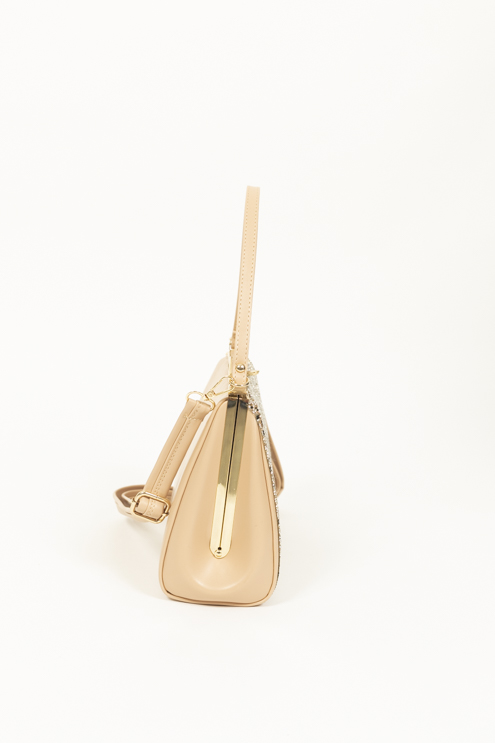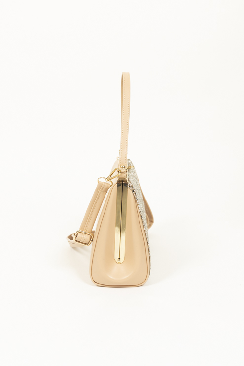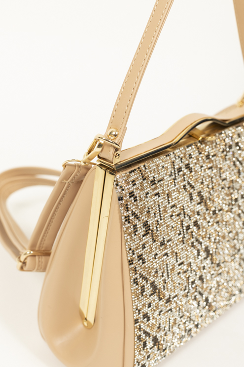De tas heeft een stevig goudkleurig frame en sluiting aan de bovenkant, waardoor je essentials veilig zijn opgeborgen. De comfortabele witte draagband maakt het makkelijk om de tas als handtas of schoudertas te dragen.