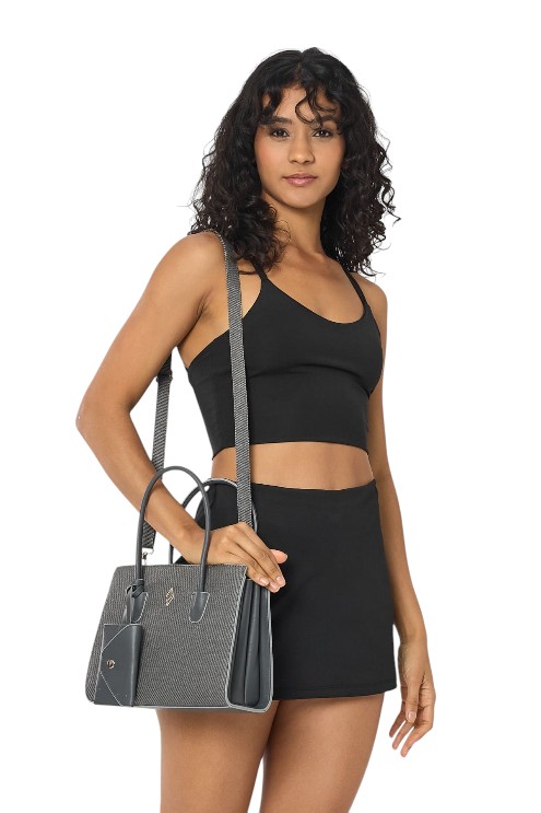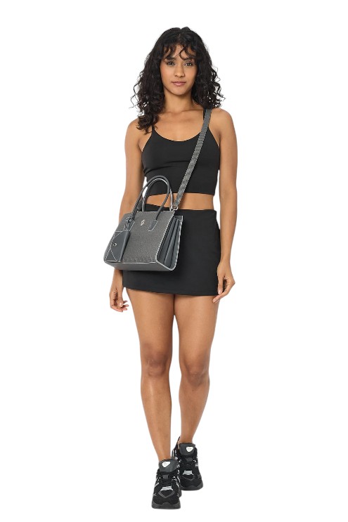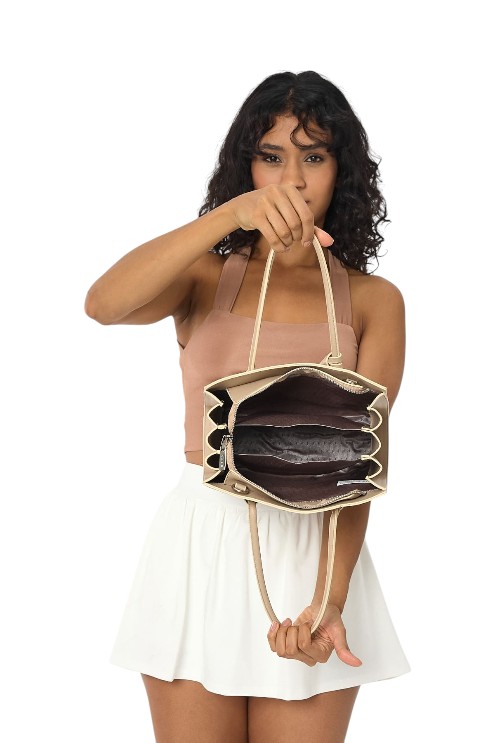 Het is een damestas van 100% PU leer.De voering is gemaakt van 60% katoen en 40% polyester.Er worden geen dierlijke materialen gebruikt in de ontwerpen.Geheel gemaakt van veganistisch leer.Er werd gebruik gemaakt van zamak accessoires.De accessoires zijn zilverkleurig.Breedte: 11 cm Lengte: 21 cm Breedte: 27 cm