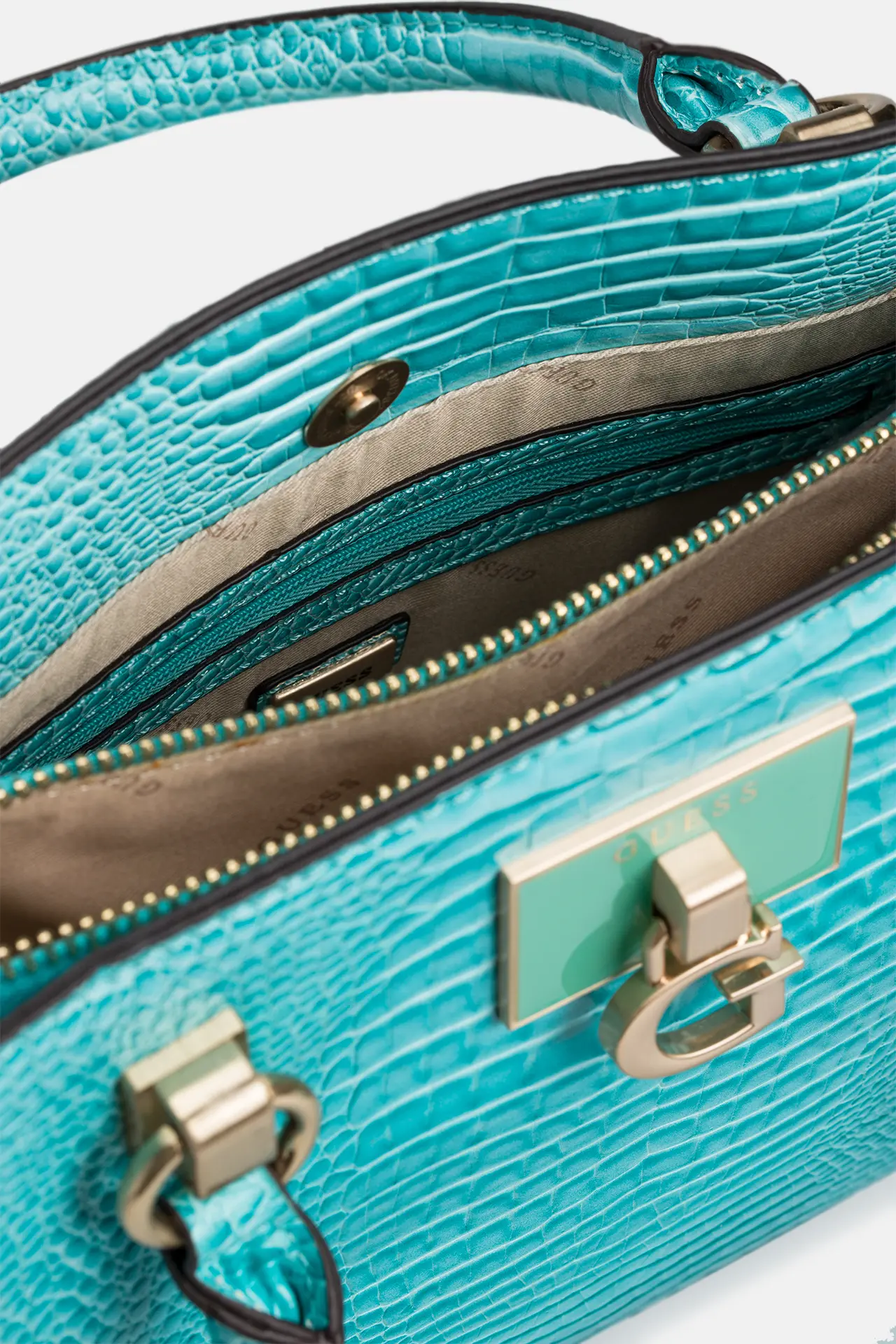 Voeg een vleugje luxe en elegantie toe aan je look met de handtas in turkoois van GUESS. Het edele slangenleer patroon geeft de tas een speciale, stijlvolle touch.