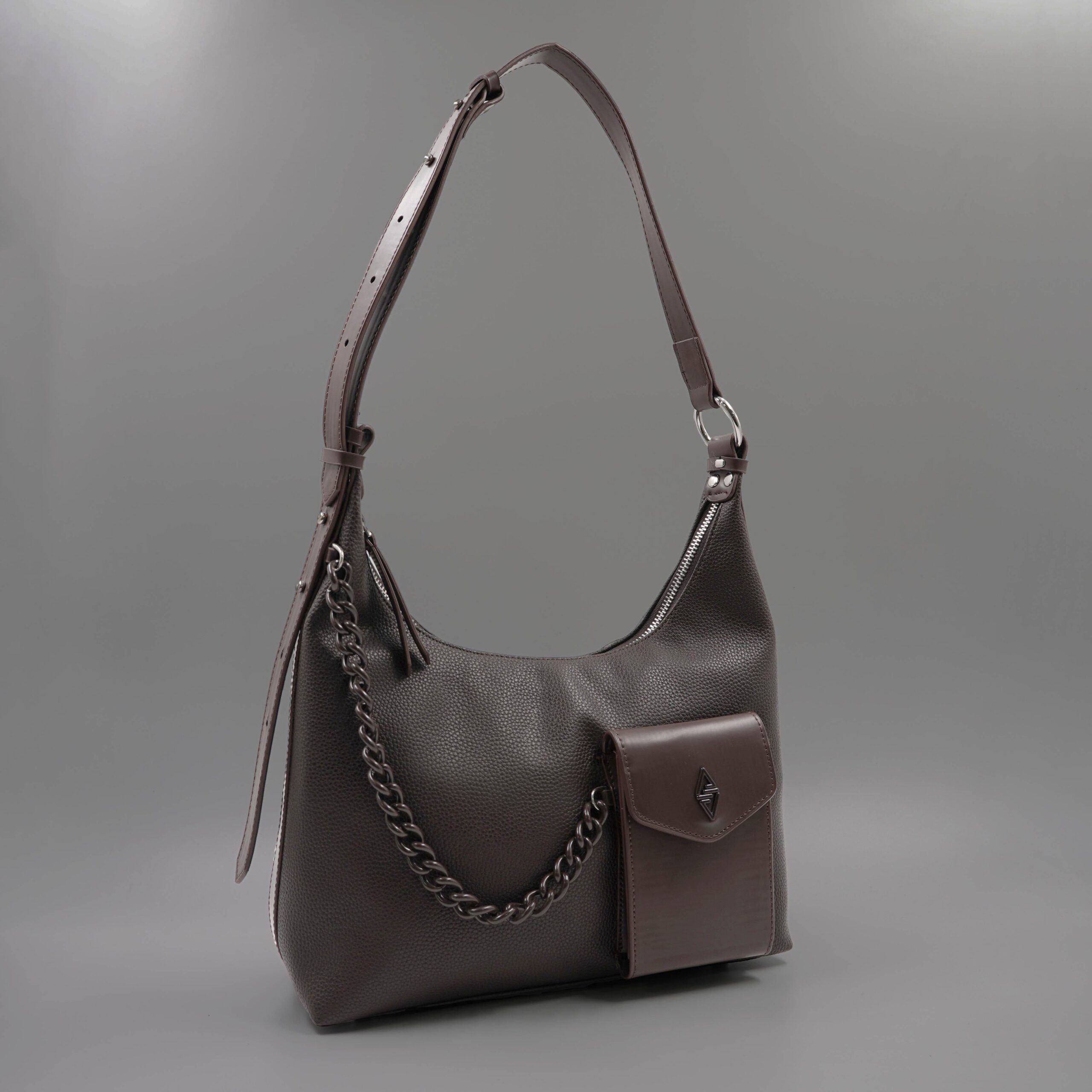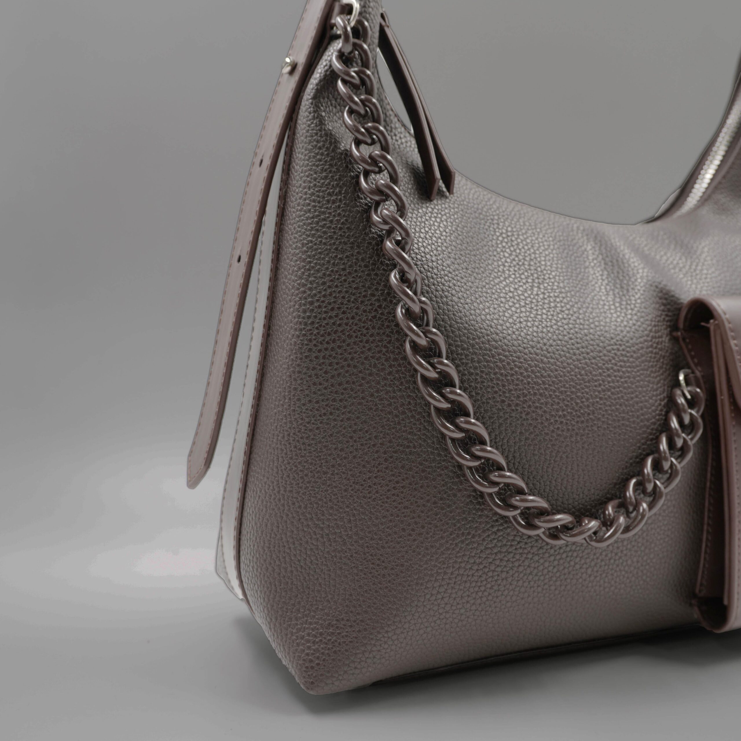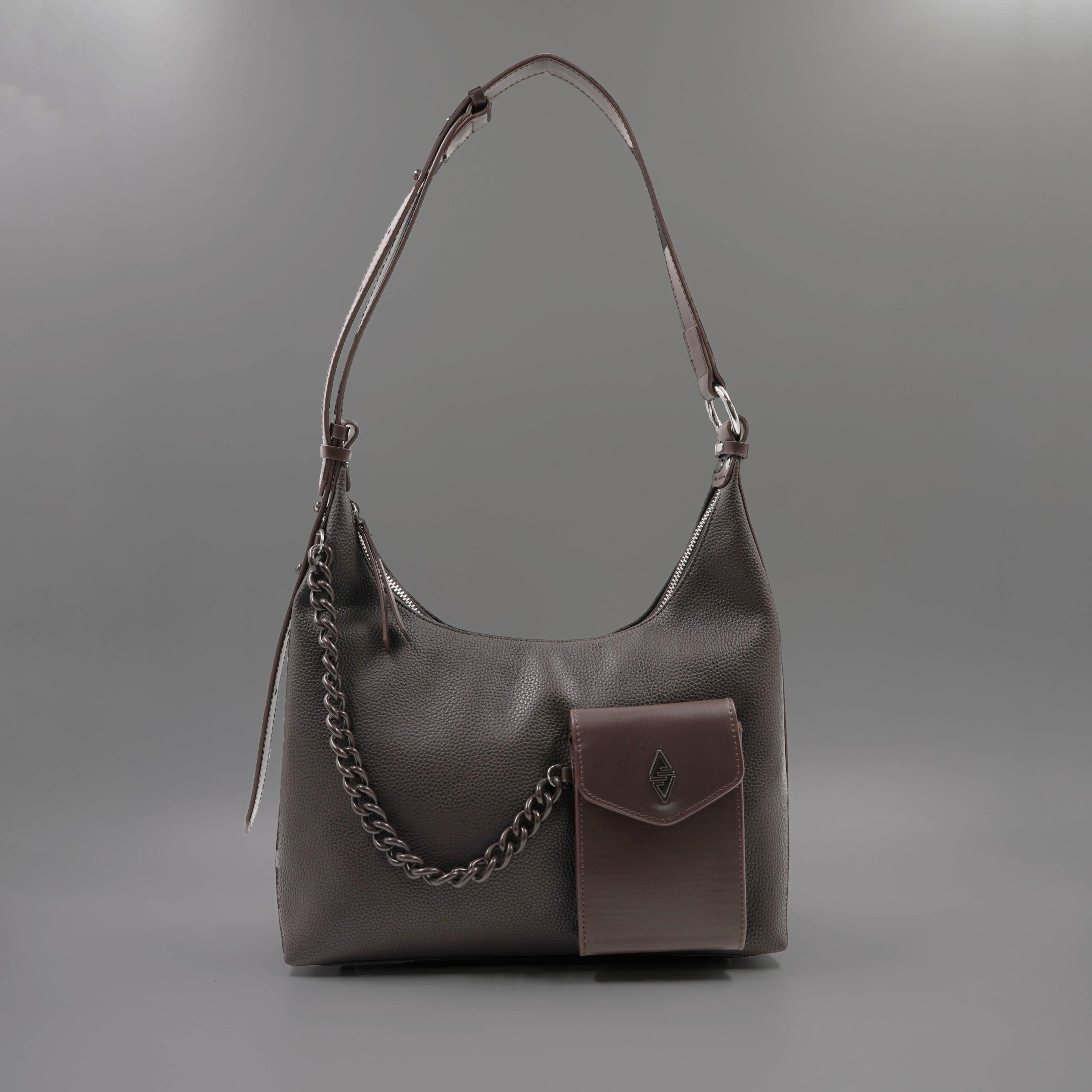 Deze handtas heeft een modern en strak ontwerp dat perfect past bij verschillende gelegenheden. Het subtiele design en de luxe accenten maken het een tijdloos accessoire dat zowel stijlvol als praktisch is. Gouden details, zoals een kettingdecoratie en een logo op de voorkant, voegen een vleugje verfijning toe.