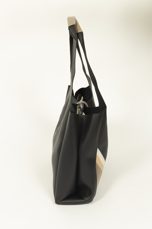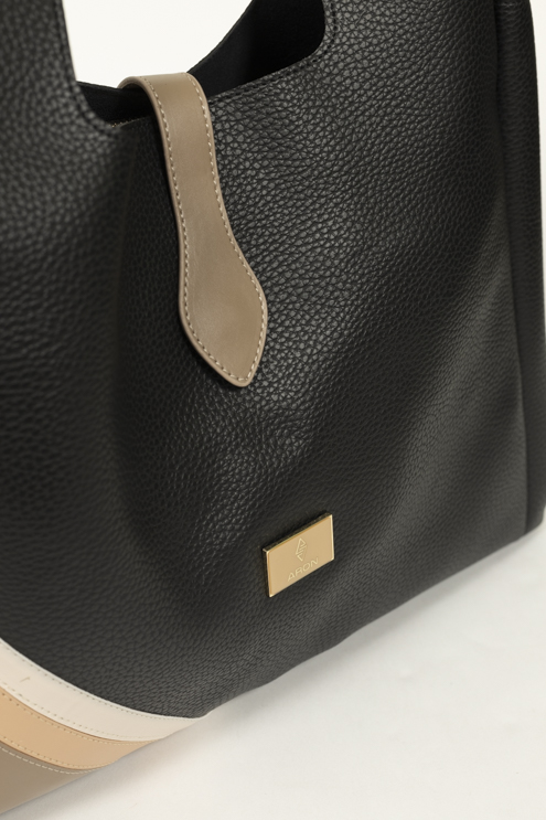 Deze handtas combineert een unieke textuur met een modern design. Opvallend is het diagonale patroon in zwart, wit en geel dat de tas een speelse en eigentijdse uitstraling geeft. Het metalen merkplaatje met de inscriptie “ARON ATELIER” voegt een verfijnde touch toe, wat bijdraagt aan de luxueuze esthetiek.