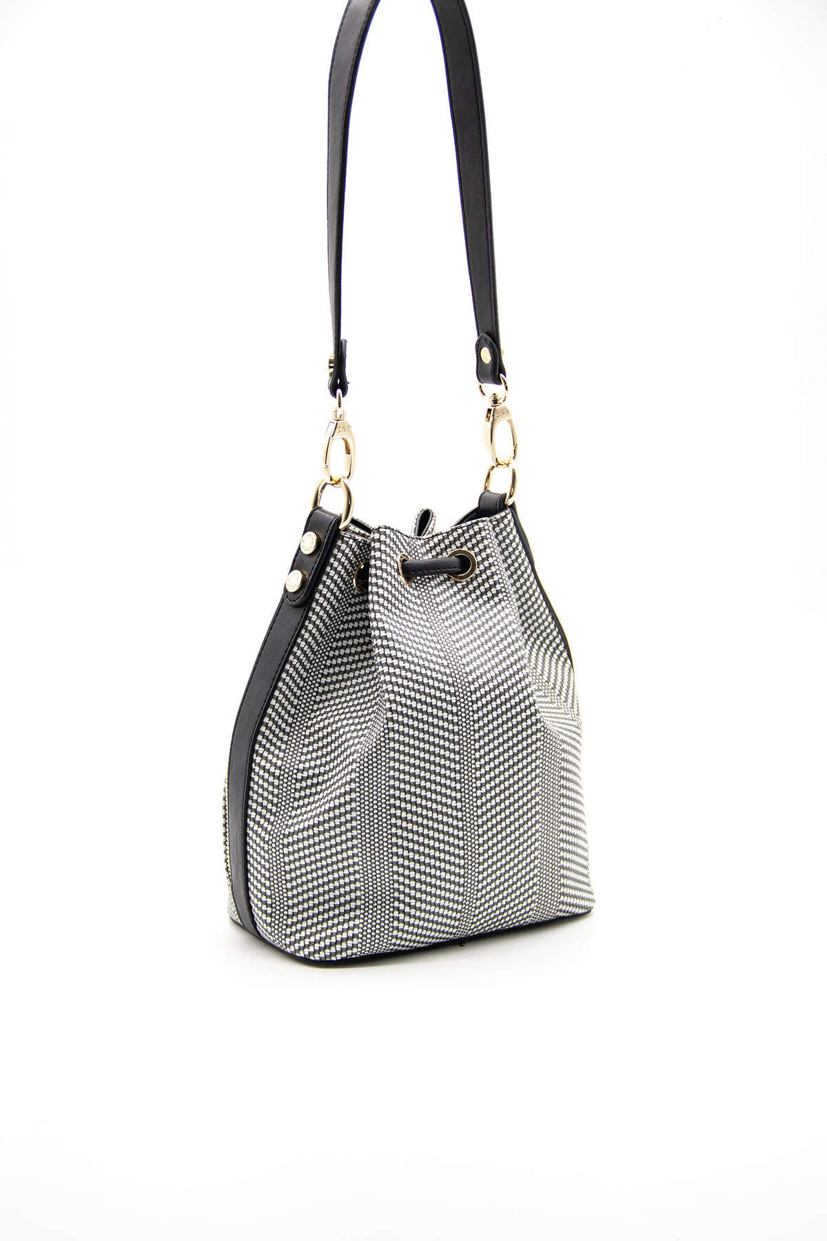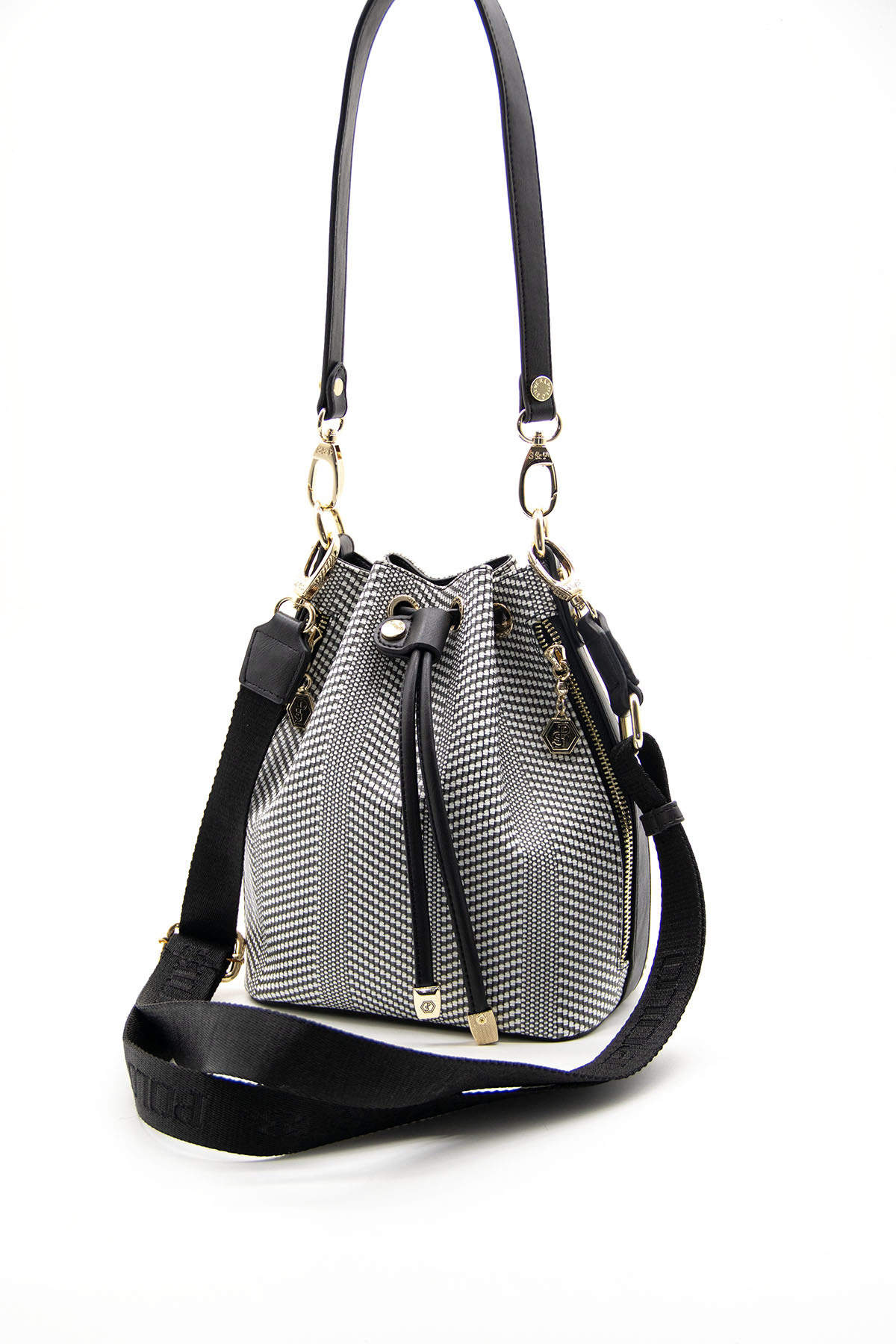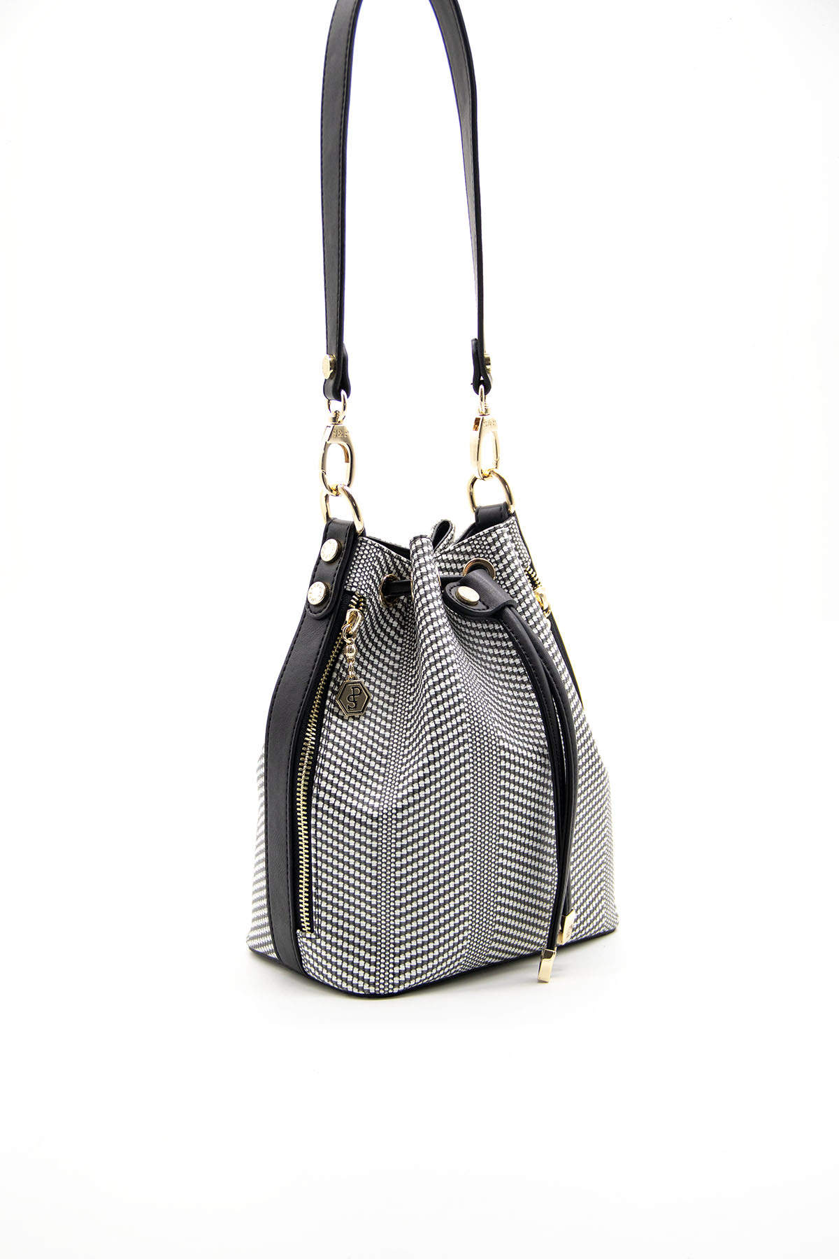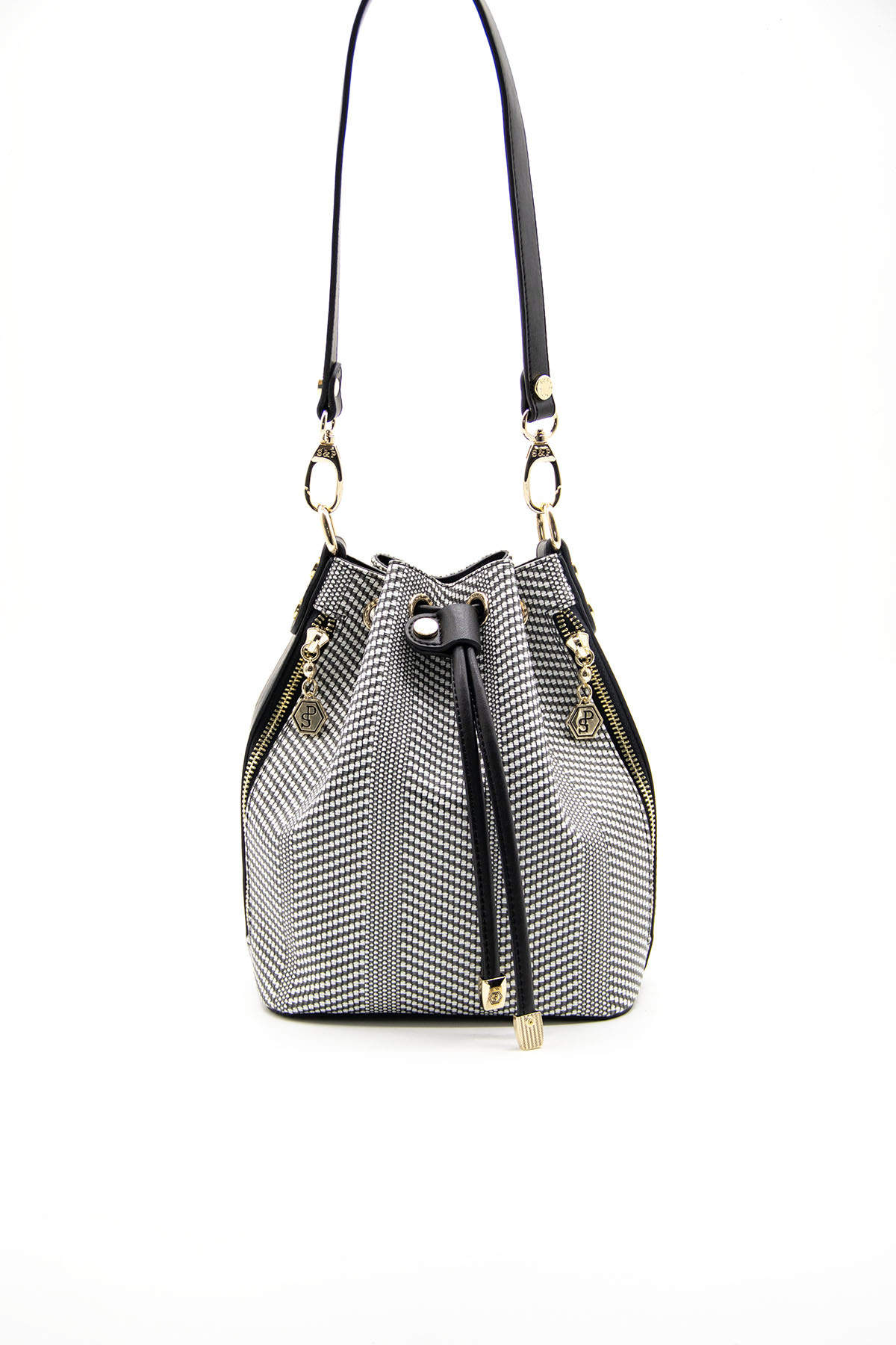 Deze moderne bucket bag van Silver Polo combineert klassieke charme met een eigentijds patroon. De stijlvolle zwart-witte print en gouden accenten maken deze tas tot een echte blikvanger.