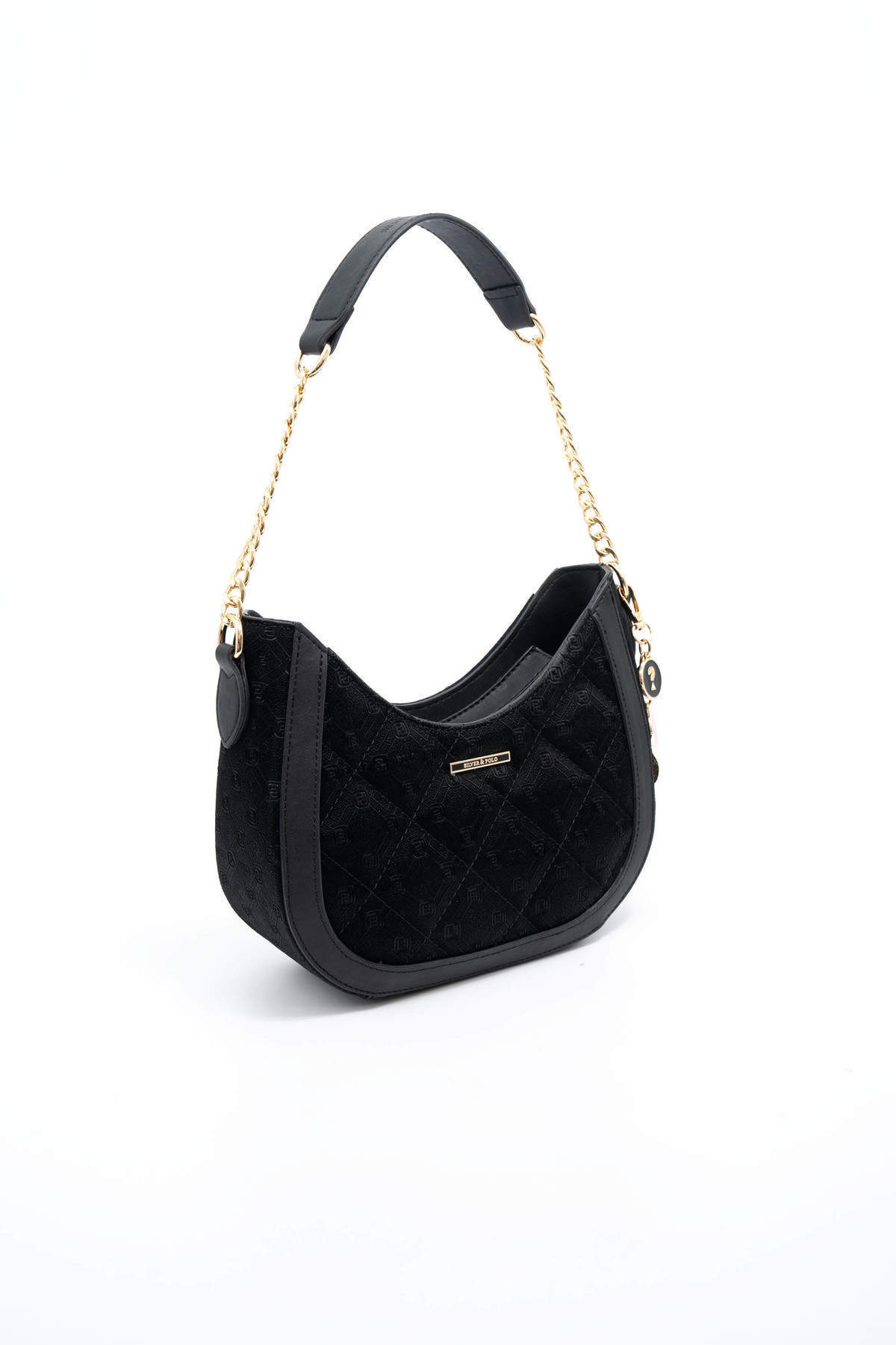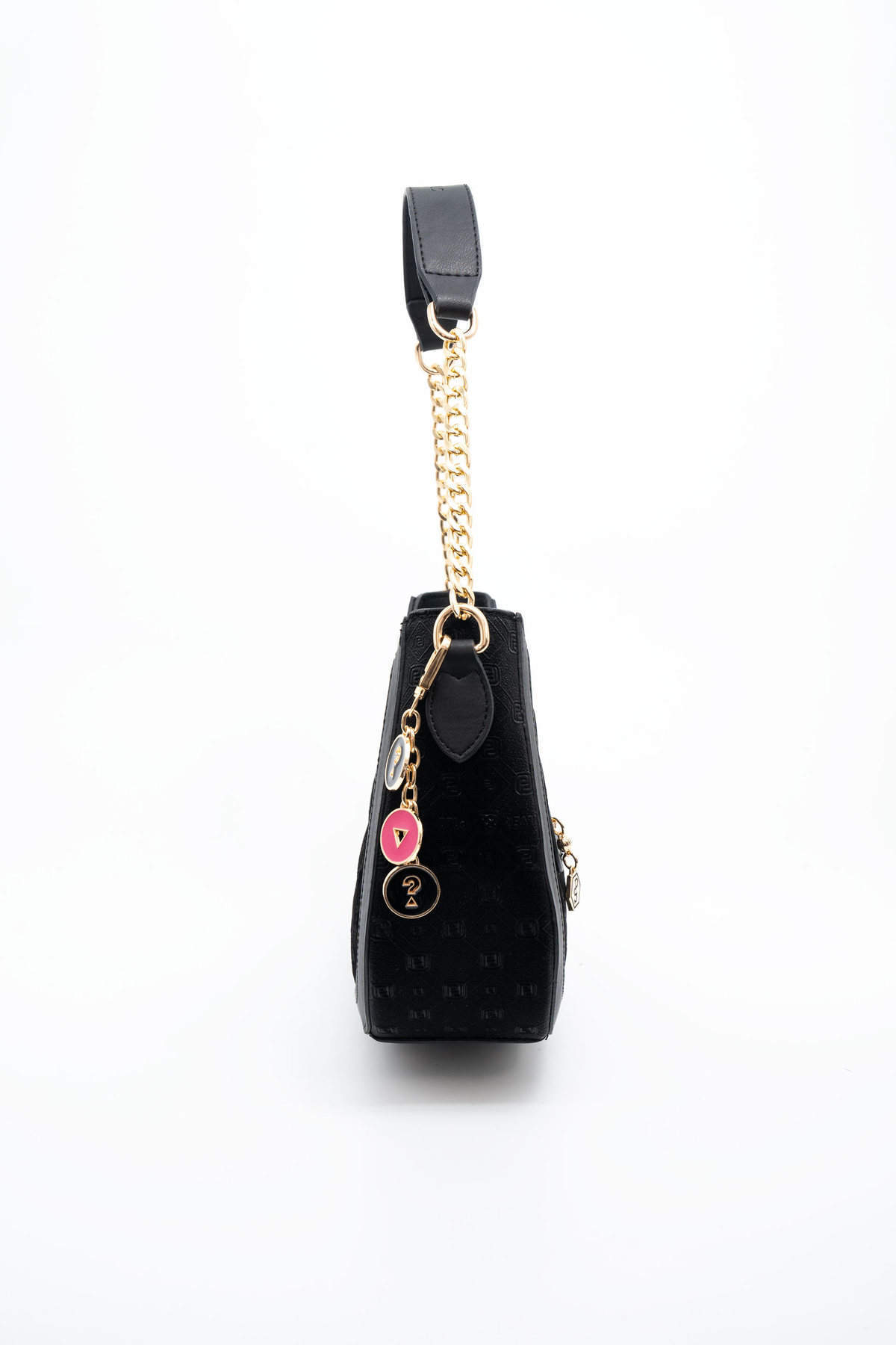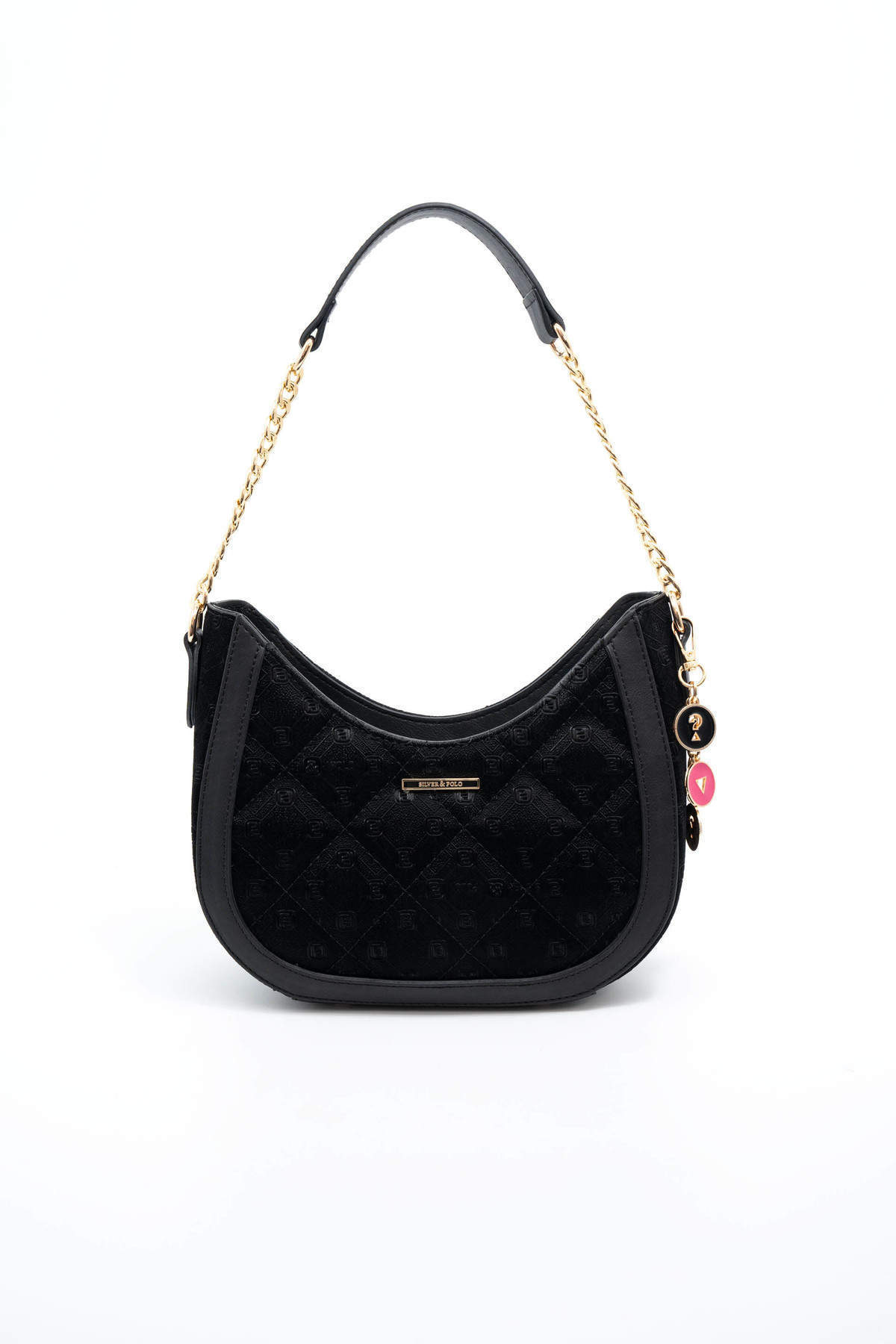 Deze stijlvolle handtas combineert een tijdloos ontwerp met een moderne uitstraling. De tas is voorzien van een uniek patroon in een gestructureerd grid, subtiele metalen accenten, en een goudkleurige kettingriem met comfortabele lederen details. De voorzijde wordt verfraaid met een decoratieve metalen plaat met het merklogo, en charmante accessoires die een speelse maar verfijnde touch toevoegen.